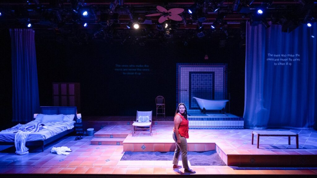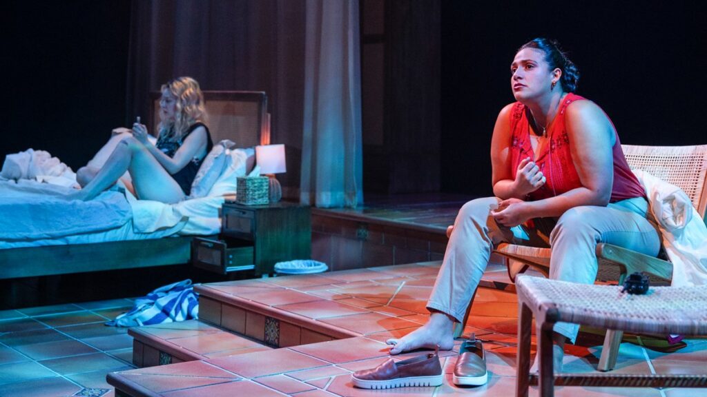 There are only two active characters on stage. Sarah, played by Dylan Brown, is a young privileged white woman from Canada, who is staying at a Cancun all-inclusive resort for her sister’s destination wedding. And Regina Carregha plays Adriana, an in control and serious Mexican woman who is the manager of house keeping at the resort. There are a few other characters and playwright Christine Quintana gives them life and presence in the script. They are the mother and sister of Sarah and the boyfriend, father, mother, aunt, and housekeeping staff in Adriana’s life. We only know them through monologues, narrations, and dialogues from Adriana and Sarah. But they bear heavily on the stories being told here.