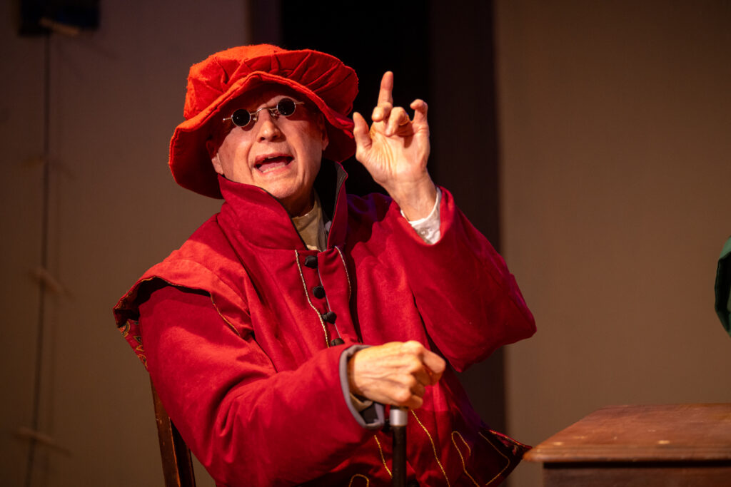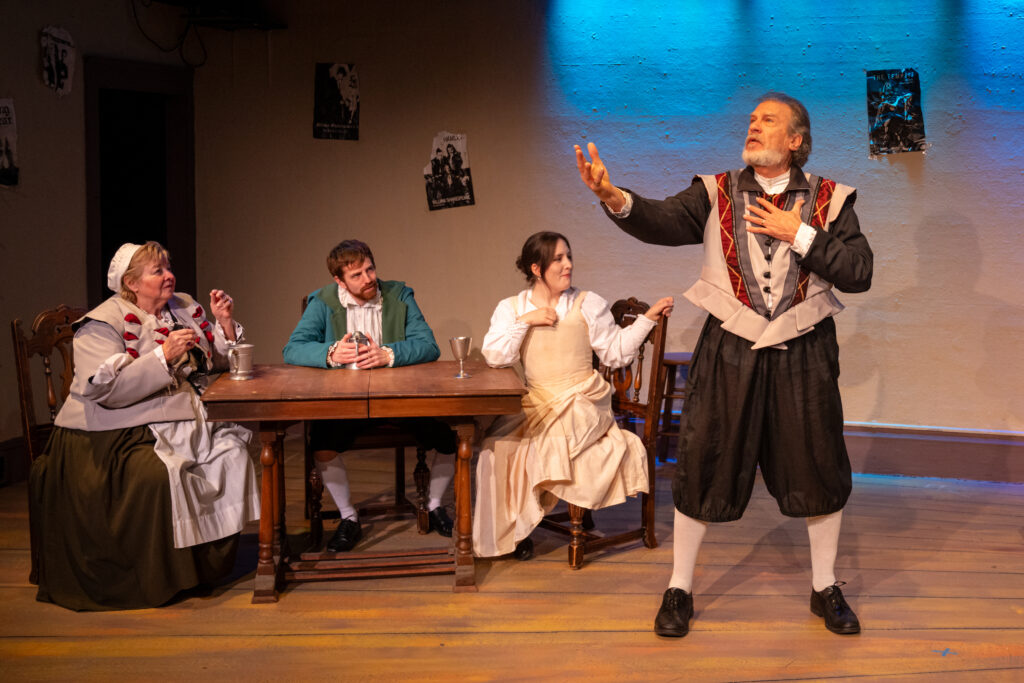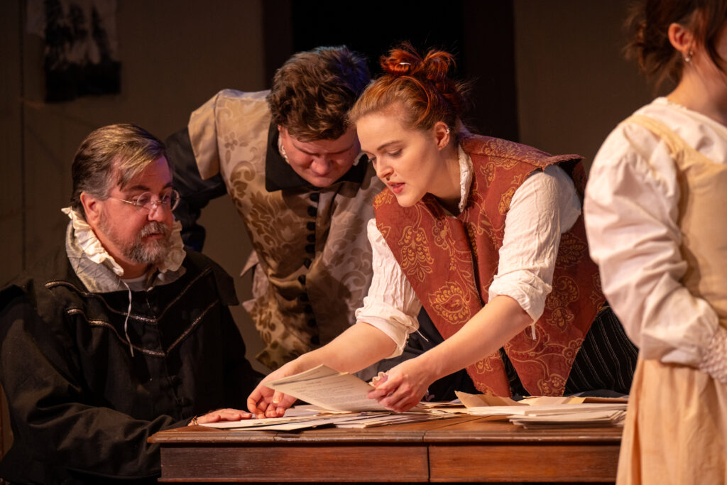 The anchor or focus is John Heminges, one of the founding members of the Globe Theater. He had given up acting to become the theater’s manager. Naturally when the group decides to assemble Shakespeare’s plays and publish them, they all turn the Heminges as the man to get it done. Cory Klein portrays Heminges as an assured and confident manager of the theater and he agrees that a folio must be produced. But during the work toward publication he expresses regret over leaving acting and at times has doubts about his ability to lead the project. And that introduces a true love story from Gunderson that certainly is worthy of a play about Shakespeare. Diane Kallas is Rebecca Heminges and John’s rock. And she has as much knowledge of the theater and Shakespeare’s importance as anybody in the company and Kallas is a solid source of support and sees past the doubts Klein portrays and insists that he complete publishing the plays. And their final scene together as she takes sick and eventually passes is so full of drama and love that you can’t help be feel choked up as well.