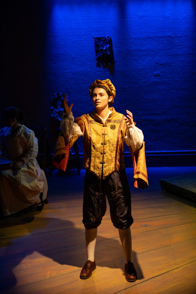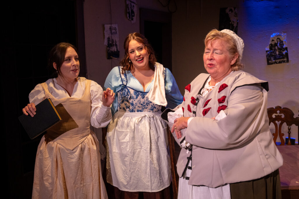 Victoria Wozniak plays a very key and central character to pulling together the disparate parts to complete the folio, Ralph Crane. The Globe’s copyist, hand writing out each part for the actors, Wozniak first gives a little bit of push back but once committed is essential to putting the plays in the correct internal order and historical order. Only Crane has handled and read every script in its entirety in the past and other than Burbage probably has the most complete understanding of the entire catalog. Wozniak certainly jumps into the work and provides a get it done no nonsense personality once the real work gets underway. And Alice Heminges is the daughter of John and Rebecca. She is also the barmaid at the Globe Tap Room. Madison Nowak is delightful as Alice. With a quick wit, an eye for who needs another round and who needs to be cut off, flirtatious at times, but always alert to the mood in the room. She would be an agile and competent barkeep in any watering hole hereabouts. She too gives her father the confidence to carry on.